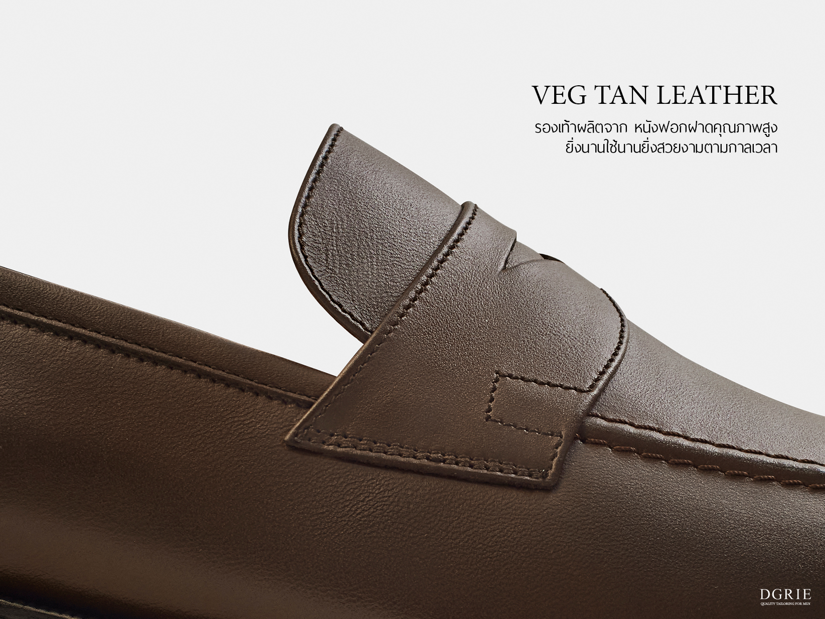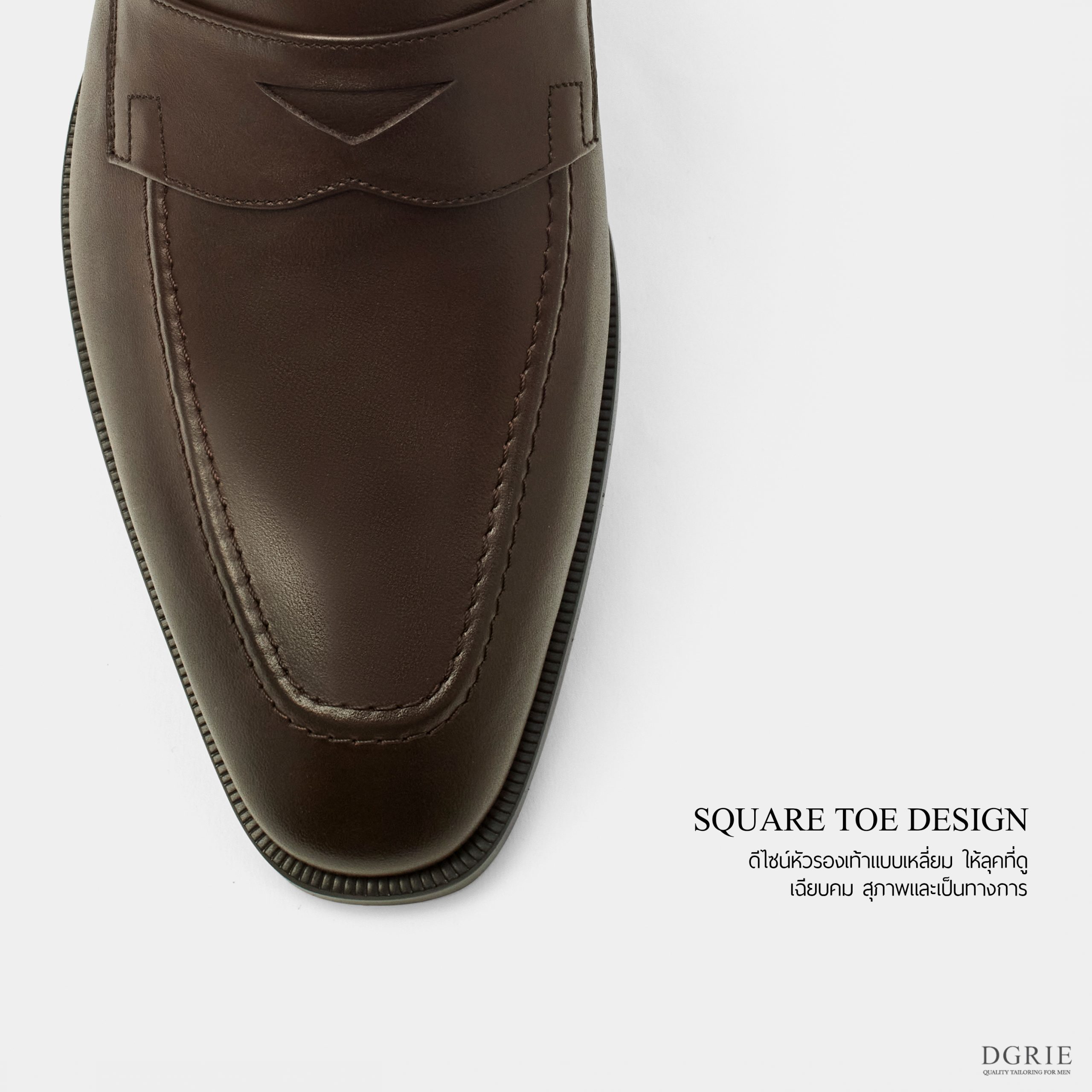 รองเท้าเพนนีโลฟเฟอร์ (Penny Loafers) ที่มาพร้อมกับความคลาสสิก ทั้งรูปทรงและดีไซน์หน้ากากรองเท้าที่ฉลุเป็นรูปสามเหลี่ยม ตัวรองเท้าผลิตจากหนังแท้คุณภาพสูง (Full Grain Leather) ในเฉดสีน้ำตาลเข้ม (Dark Brown) จะโชว์มิติของชั้นผิวหนัง (Texture) และลวดลายตามธรรมชาติได้ชัดเจนกว่า ช่วยขับให้เห็นความ “พรีเมียม” ของหนัง Full Grain ได้ดีเมื่อกระทบแสง ตกแต่งความเงางามด้วยเทคนิค Antique Finish ซึ่งเป็นการปัดสีและแว็กซ์ด้วยมือ มอบมิติสีที่สวยงามจากฝีมือช่างผู้ชำนาญการ รองเท้าถูกออกแบบด้วยทรง Wide and Slim หน้าเท้ากว้างพิเศษเพื่อให้สวมใส่สบาย แต่ยังคงดีไซน์ที่ดูเรียวสวย หัวรองเท้าแบบเหลี่ยม (Square Toe Design) ให้ลุคที่เฉียบคมและเป็นทางการ เหมาะกับทุกสถานการณ์ แมตช์ง่ายทั้งลุควันสบายๆ ไปจนถึงลุคที่ต้องการความเนี๊ยบ
