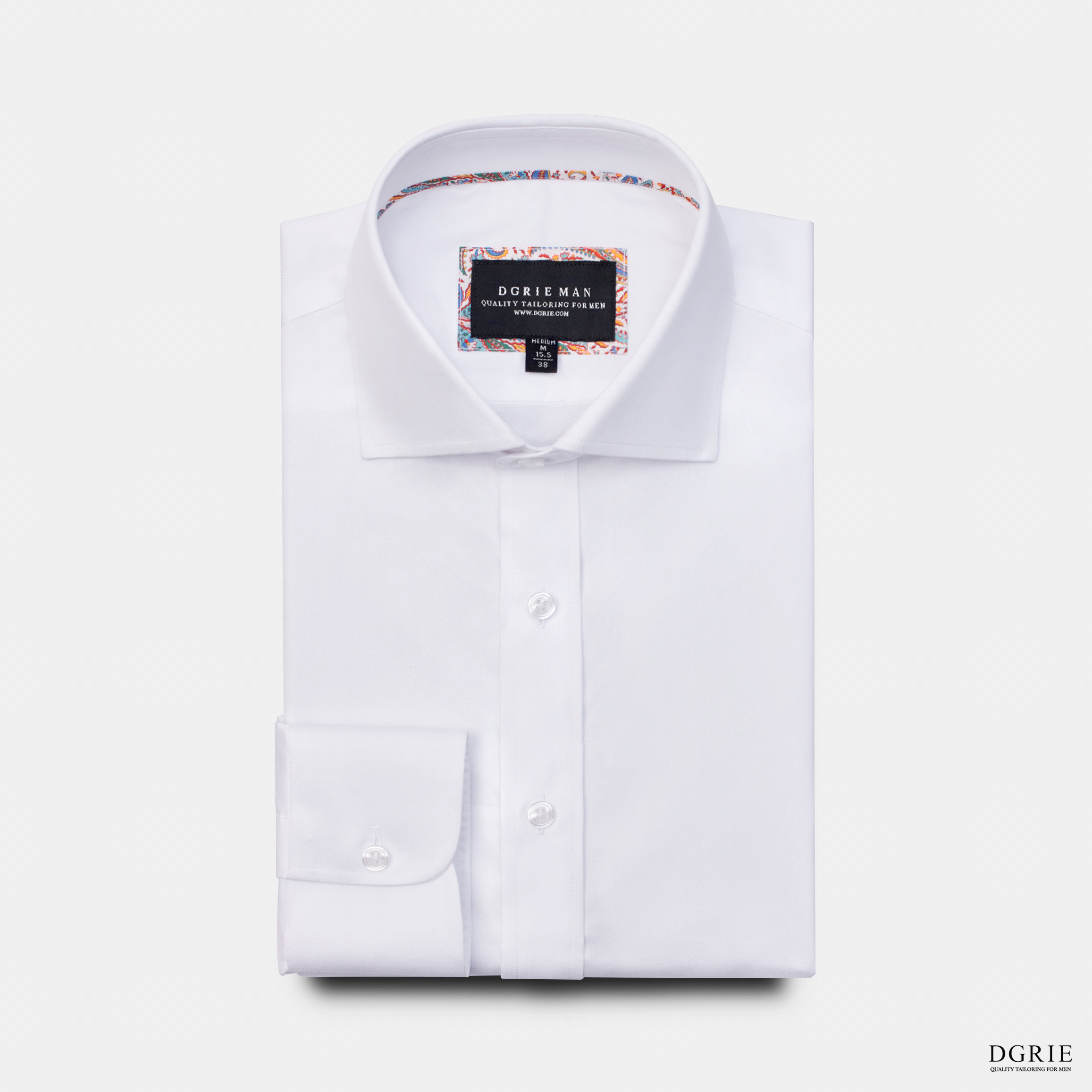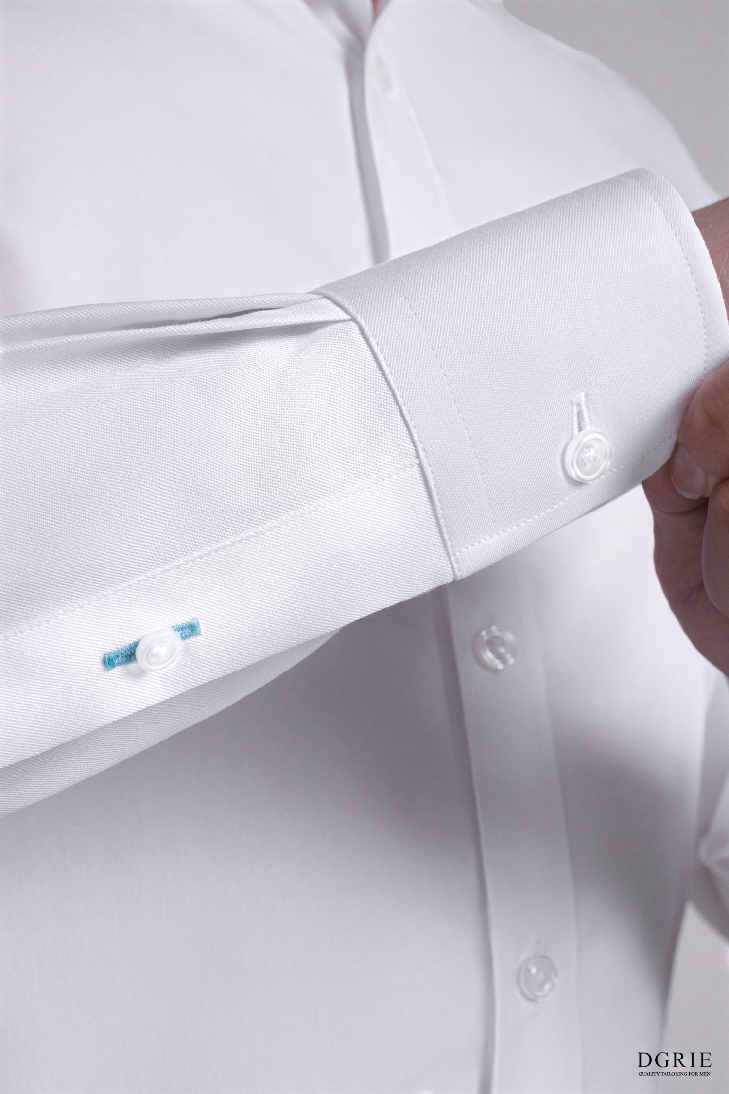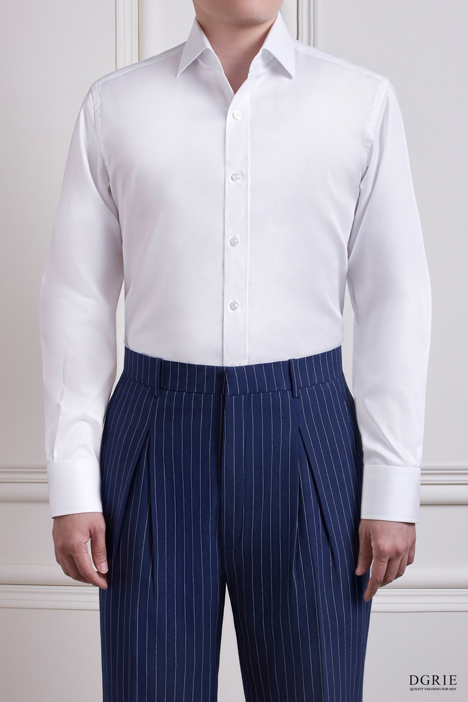 เดรสเชิ้ตสีขาว ผ้าคอตตอนทวิลคุณภาพสูง (Premium Cotton) เนื้อผ้ามีความละเอียด นุ่มสบายผิว และระบายอากาศได้ดีเยี่ยม ผ้าทอมีความหนาพอเหมาะทำให้เสื้อดูเป็นทรงสวย ไม่บางจนเห็นทะลุ และยับยากกว่าคอตตอนทั่วไป โดดเด่นด้วยการกุ๊นขอบปก แต่งลายลูกน้ำ (Paisley) บริเวณฐานคอด้านใน ช่วยเสริมให้ช่วงคอดูมีโครงสร้างที่แข็งแรงและสะอาดตา เพิ่มมิติเมื่อปลดกระดุมเม็ดบน ตัวปกเป็นทรงปกป้าน (Spread Collar) ขนาดกว้าง 6.5 cm ให้ความรู้สึกโมเดิร์นและภูมิฐาน ใส่ได้ทั้งแบบผูกเนกไท (ช่วยให้ปมเนกไทดูเด่น) หรือจะปลดกระดุมเพื่อลุคสบายๆ ในวันลำลอง ก็ยังรักษาทรงปกได้สวยงาม ให้สัมผัสเหมือนสวมเชิ้ตงานสั่งตัดในทุกมิติ
